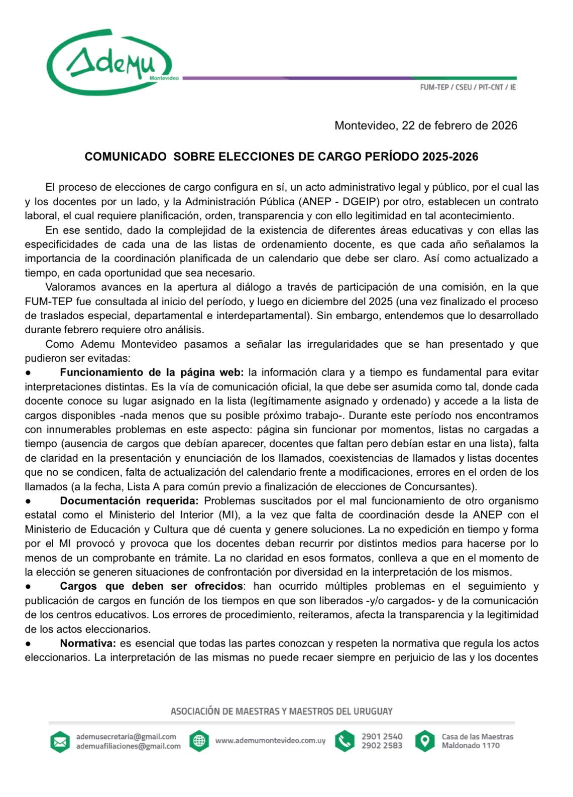 COMPARTIMOS LA DECLARACIÓN DEL SECRETARIADO DE ADEMU MONTEVIDEO SOBRE EL PROCESO DE ELECCIONES DE CARGOS 2025 - 2026.