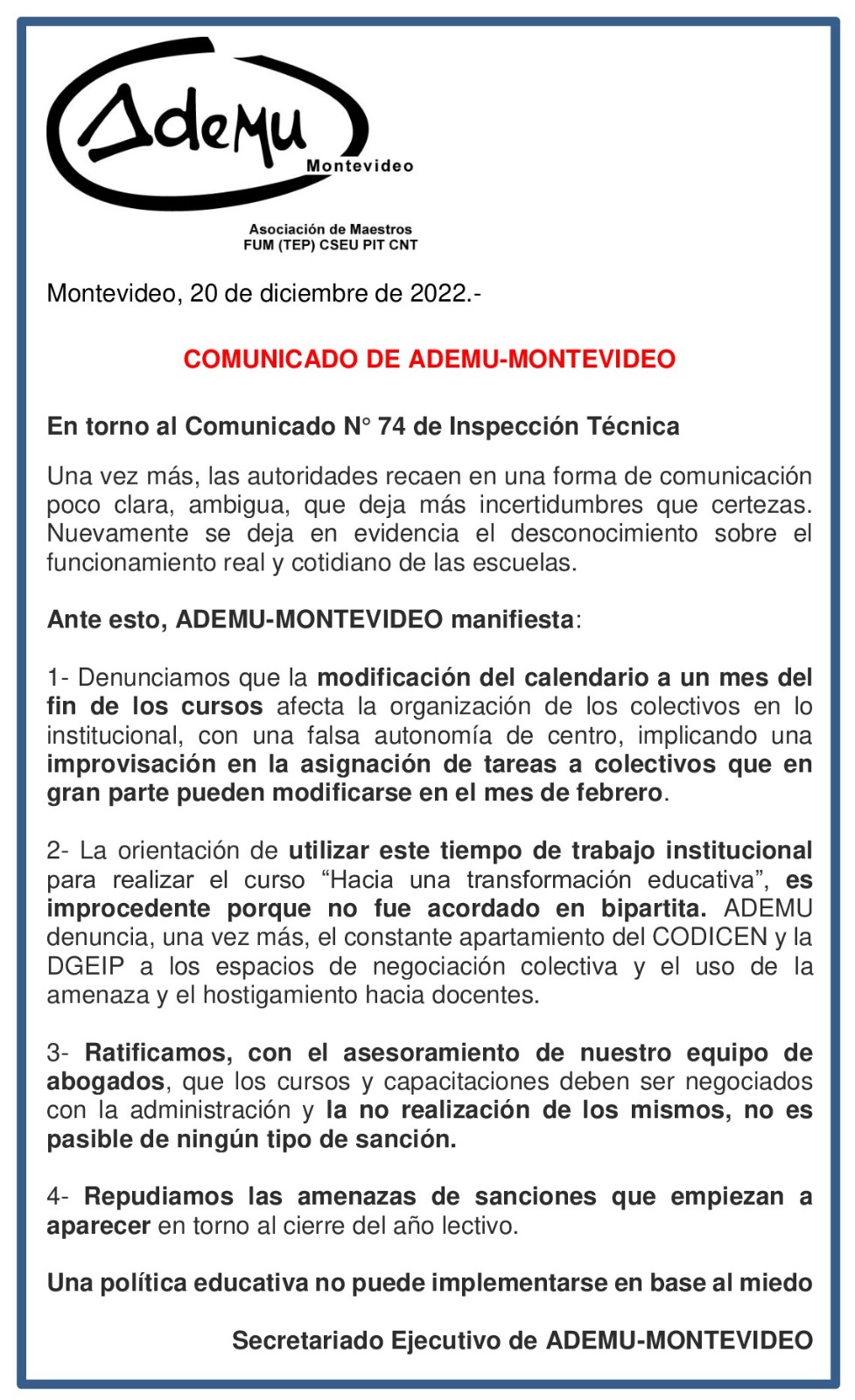 Comunicado: "En torno al Com. Nº 74" de Inspección Técnica